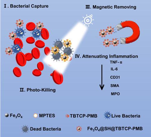 该研究制备了一种阳离子AIE光敏剂武装的磁性颗粒,即Fe3O4@SH@TBTCP-PMB,用于治疗败血症。阳离子光敏剂具有高效的ROS生成效率和优秀的细菌结合能力,这些特性与Fe3O4的磁捕获和磁分离特性协同作用,使得Fe3O4@SH@TBTCP-PMB在低浓度下能够迅速捕获革兰氏阳性细菌,并在光照条件下显著灭活耐药细菌。AIE PS功能化的磁性NPs展现出广泛的应用潜力,通过抑制炎症因子和细胞因子以减少炎症反应,有助于改善多器官功能障碍,恢复先天免疫防御系统,为克服多药耐药细菌引发的血液感染提供了有效的治疗策略。