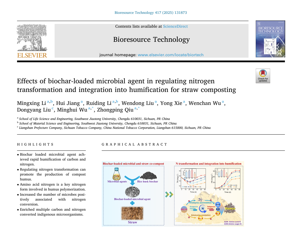 近日,环境科学领域顶级学术期刊《Bioresource Technology》(影响因子9.7,中科院1区TOP期刊)报道了开云kaiyun网页版官网邱忠平教授团队的研究成果“Effects of biochar-loaded microbial agent in regulating nitrogen transformation and integration into humification for straw composting”,论文第一作者为2021级博士研究生李明星,通讯作者为吴明蔧老师和邱忠平教授,西南交通大学生命科学和工程学院为第一通讯单位。