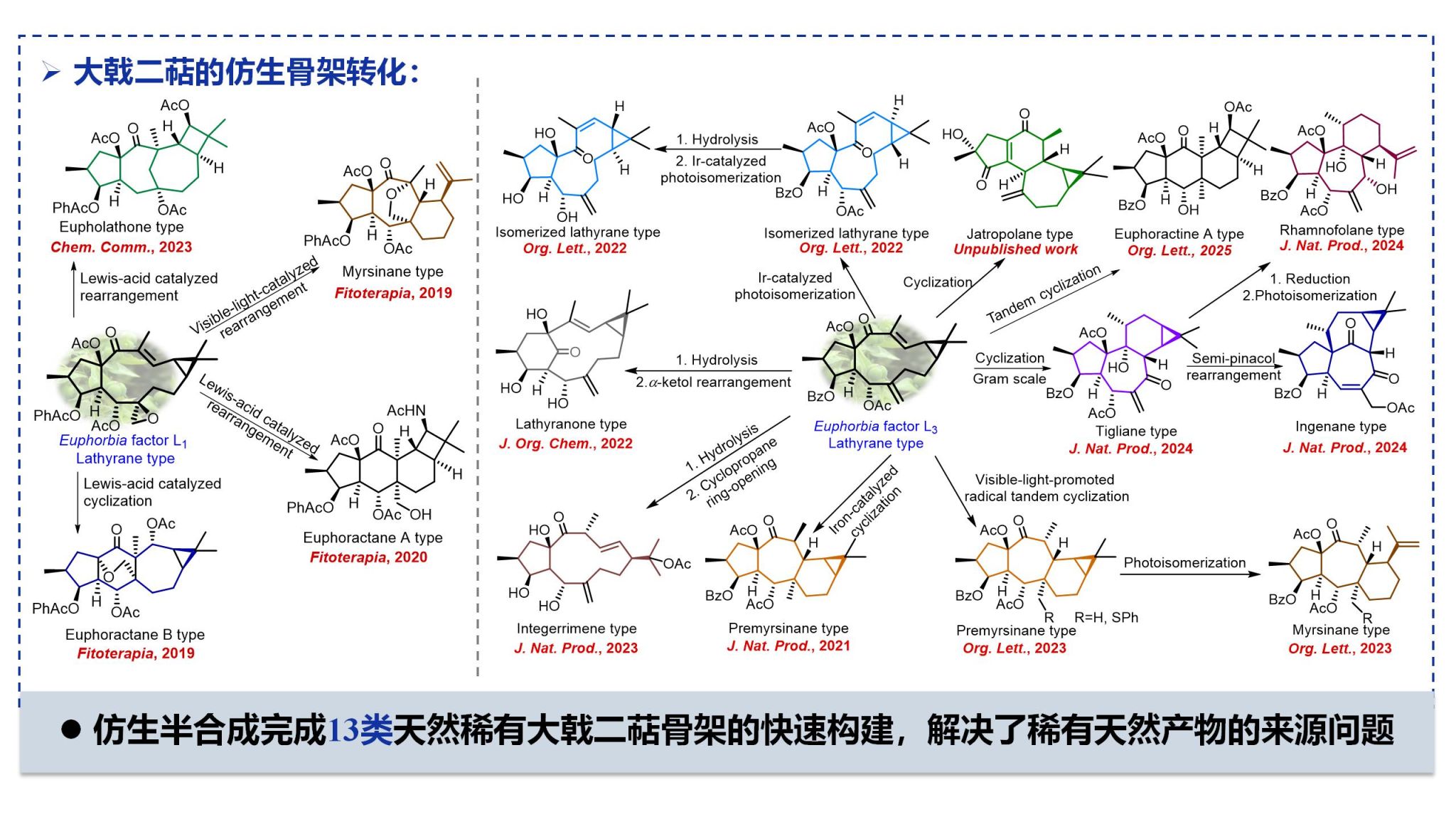 大戟二萜类化合物是大戟属植物中一类重要的特征性次生代谢产物。由于其独特的化学结构和广泛的生物活性,大戟二萜类化合物一直以来有机化学和药物化学领域的研究热点。目前已经从大戟植物中分离超过1500种大戟二萜,超过40种骨架类型。一些稀有骨架大戟二萜的含量和成员数量在自然界中极低,这严重限制了其生物活性的研究。