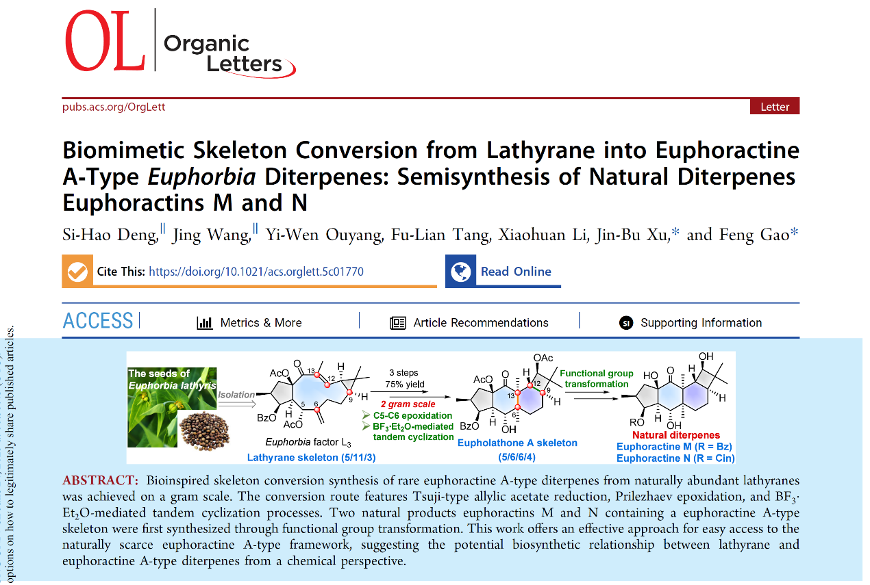 近日,有机化学国际权威期刊《Organic Letters(中科院1TOP期刊,Nature指数期刊)上在线发表开云kaiyun网页版官网高峰教授团队的最新研究成果“Biomimetic Skeleton Conversion from Lathyrane into Euphoractine A‑Type Euphorbia Diterpenes: Semisynthesis of Natural Diterpenes Euphoractins M and N”。硕士研究生邓思浩和王婧为第一作者,硕士研究生欧阳艺文和唐博莲,以及李晓欢副教授参与该项工作,高峰教授和徐巾卜助理教授为通讯作者,西南交通大学是唯一通讯单位。