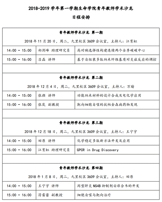 生命科学与工程学院青年教师学术沙龙旨在为青年教师提供一个宽松、自由、平等的学术交流平台。营造自由探究、鼓励学术争鸣、活跃学术思想、促进学科交叉,同时加强生命学院青年教师联系,相互启发,共同进步,碰撞出学术火花。本沙龙定期举办(每期学术沙龙每2周举办一次),每期由两位青年老师做学术报告,邀请学院青年教师及研究生参加,通过自由讨论的形式,鼓励创新,提高青年教师学术水平,促进学院科研工作快速发展。