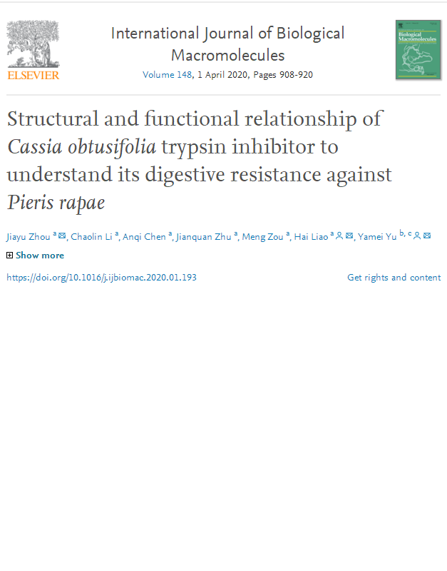 生命科学与工程学院“药用植物资源与分子生物学实验室”在国际刊物International Journal of Biological Macromolecules(IF4.784,JCR一区)在线发表文章“Structural and functional relationship of Cassia obtusifolia trypsin inhibitor to understand its digestive resistance against Pieris rapae”。 该文在撰写过程中得到了清华大学隋森芳教授(西南交通大学双聘院士)与西南交通大学黄新河副教授的指点,特此表示感谢。