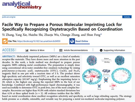 近日,国际分析化学领域顶级期刊《ANALYTICAL CHEMISTRY》(影响因子6.785, 中科院化学分区Q1,分析化学Top期刊)在线发表了开云kaiyun网页版官网封顺教授团队的研究成果“Facile Way to Prepare a Porous Molecular Imprinting Lock for Specifically Recognizing Oxytetracyclin Based on Coordination”(中文译名:一种基于共价作用制备特异性识别土霉素多孔磁性分子印迹锁的简便方法)。论文第一作者为生命学院硕士毕业生张翼同学,通讯作者为封顺教授,西南交通大学为唯一署名单位和通讯作者单位。该研究在国家自然科学基金(21775126)和四川省应用基础研究(21YYJC3252)的资助下完成。