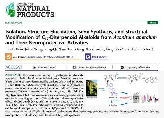 在国家自然科学基金面上项目(81773605)的资助下,生命科学与工程学院周先礼教授团队在天然产物化学国际权威期刊《Journal of Natural Products》(影响因子3.779,中科院一区,天然产物化学Top期刊)上,以我校为唯一署名单位发表了题为“Isolation, Structure Elucidation, Semi-Synthesis, and Structural Modification of C19-Diterpenoid Alkaloids from Aconitum apetalum and Their Neuroprotective Activities”的研究论文。论文第一作者为生命科学与工程学院博士研究生万琳茜,通讯作者为高峰教授和周先礼教授。