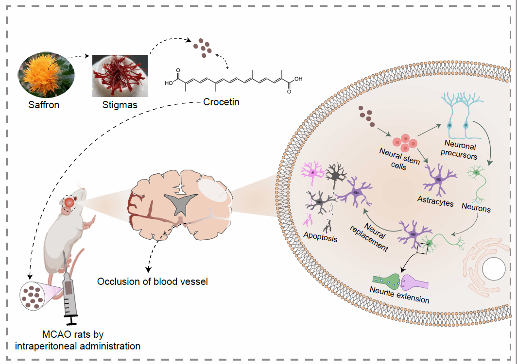 近期,生命科学与工程学院谭睿教授课题组与中国科学院苏州纳米所程国胜研究员团队组合作,对藏药研究取得的重要突破以封面论文形式发表于国际著名生物医学期刊Advanced Healthcare Materials(TOP1,IF:11.092)上(题为:Crocetin Regulates Functions of Neural Stem Cells to Generate New Neurons for Cerebral Ischemia Recovery)。他们发现藏花酸可通过调控内源性神经干细胞分化产生新的神经元(神经细胞),改善缺血性脑卒中引起神经元大量死亡的现象,从而修复脑缺血性大鼠神经功能性损伤。近年来,脑卒中再生医学研究主要集中在干细胞进行的细胞移植修复。虽有一些令人激动的研究结果,但干细胞替代治疗仍然面临一些障碍,包括免疫排斥、伦理学争论等。该课题组基于临床药效的藏药经典名方中获取诱导体内神经元细胞再生藏药有效成分的报道,是神经细胞再生与神经功能修复领域的一个重要突破,也是传统中药(藏药)治疗脑卒中认识的一个重要突破。