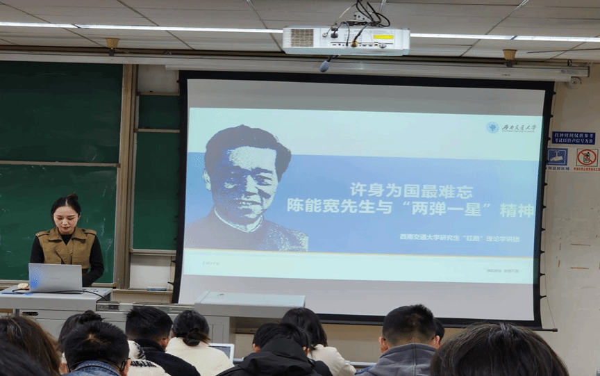 接着,研究生“红路”理论学讲团副团长何佳乐同学以“陈能宽先生与‘两弹一星’精神”为主题,为同学们分享了陈能宽院士许身为国的伟大精神。详细介绍了西南交通大学校友、“两弹一星”功勋奖章获得者陈能宽院士的生平事迹和所获成就。通过学习,同学们了解了陈能宽院士从出国求学、扬名海外到毅然回国、科技报国的经历。最后何佳乐号召同学们学习陈院士不畏艰辛、淡泊名利、甘于奉献的许身为国精神。