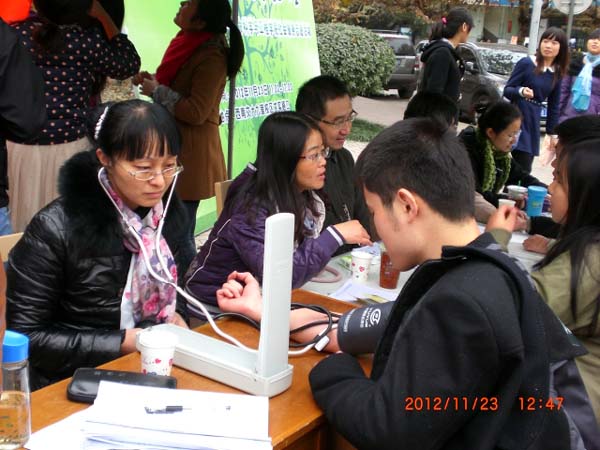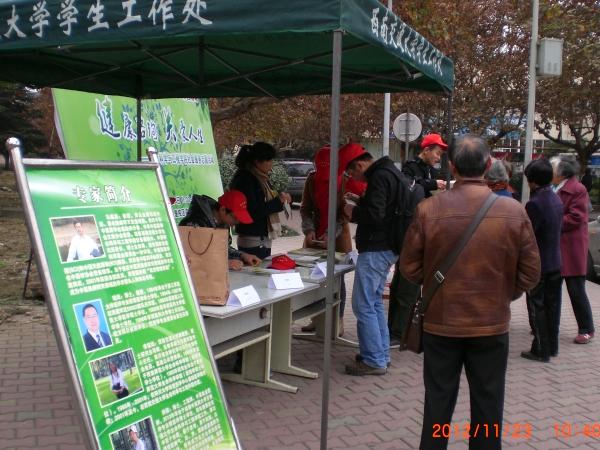 1121起,生命学院2012级研究生两个党支部的所有党员就拉开了该项活动的宣传工作序幕,他们发放传单、进行讲解,向广大师生简要介绍了本次活动的目的和内容。生命学院党委副书记王书会和研究生辅导员贺妍还多次到场进行指导。112311:00,生命学院的五位专家学者准时到场,而此时现场已有一些老年人和同学在等候。五位专家一就座,就开始细心听取咨询者们反映的关于自身健康和营养方面的问题。他们耐心地帮咨询者进行分析和指导,给出了自己的意见和建议,中医药“大夫”们还现场开具了处方,让咨询者们心满意足。过往的很多学生也纷纷赶过来,测量血压、营养咨询、询问病因和预防措施……路过并咨询的人也越来越多,在场专家和党员志愿者们也忙的不亦乐乎,五位老师在现场简单地用完盒饭后马上又投入到了咨询服务中去。尽管天气略显寒意,但丝毫挡不住大家的服务热情,咨询现场一度火热。直至下午五点,仍有不少人前来咨询,老师和志愿者们坚守岗位,竭诚为最后一位咨询者服务完才离开。