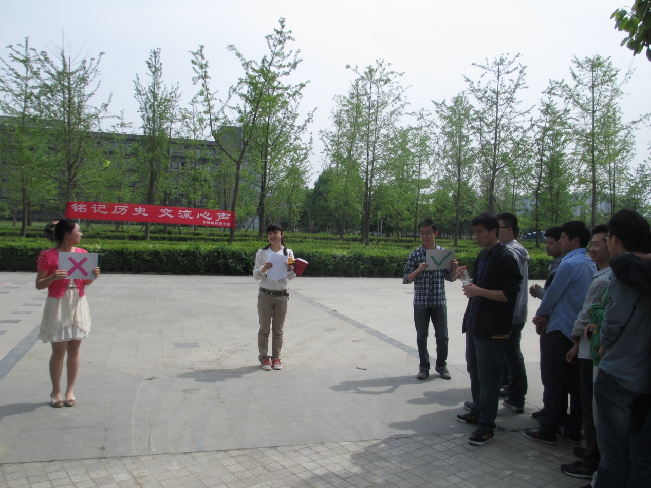 为了加强制药工程专业各年级同学之间在生活、学习和工作等方面的互动交流,同时学习并巩固十八大党章知识和专业知识,增强党支部的凝聚力, 4月14日下午2:30-4:30,本科制药党支部在图书馆前广场举办了主题为“铭记历史、交流心声”的示范交流活动。活动寓教于乐,通过“站战队”答题环节、“阳光伙伴”绑腿活动和趣味红歌填词等游戏,让各年级学生之间熟悉起来,然后请一些优秀的学长学姐给大家交流经验,同学们也争先恐后提出自己关心的问题,包括考研、保研、就业以及平时的学习、工作和生活等相关问题,学长学姐都耐心做出了解答。最后各年级学生之间互留联系方式,并合影留念,此次示范交流活动圆满结束,但私下的交流仍在持续。