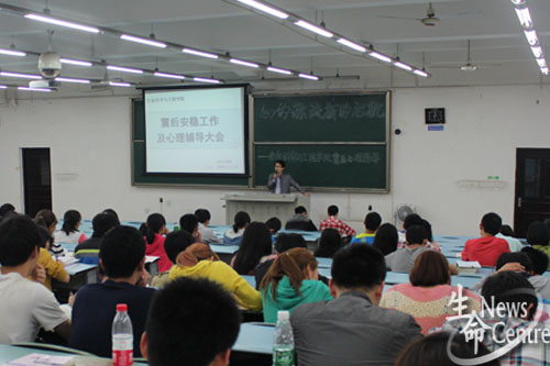 崔老师首先向大家传达了学校关于这次震后安全稳定工作的最新精神,提醒同学不要恐慌,但仍要保持警惕,提防余震,要相信政府,相信学校。第二部分,崔老师向大家详细介绍震时逃生原则和被埋之后的自救方法,并结合“5·12”汶川地震时的具体情况和学校一系列应付措施,特别指出,如发生余震,同学们应及时有序地向临时避难所疏散,并以教学区和宿舍区的示意图加以解释,切忌因惊慌而出现踩踏事故;住高层同学的同学遇震时要及时切断电源,打开门,寻找“三角区”或狭小稳固的空间,一定不要选择跳楼。