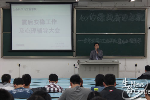 4月20日上午8:02,四川省雅安市芦山县发生7.0级地震,震源深度13公里,成都市震感强烈,此后大小余震不断,给同学们带来了严重的心理压力和极大的精神恐慌。为了传达学校相关规定、注意事项以及普及逃生知识,4月23日晚7:00,生命科学与工程学院团委书记,2011、2012级辅导员崔健老师于X2321教室召开年级大会,在两个小时时间内,崔老师分别针对大一、大二年级进行辅导。