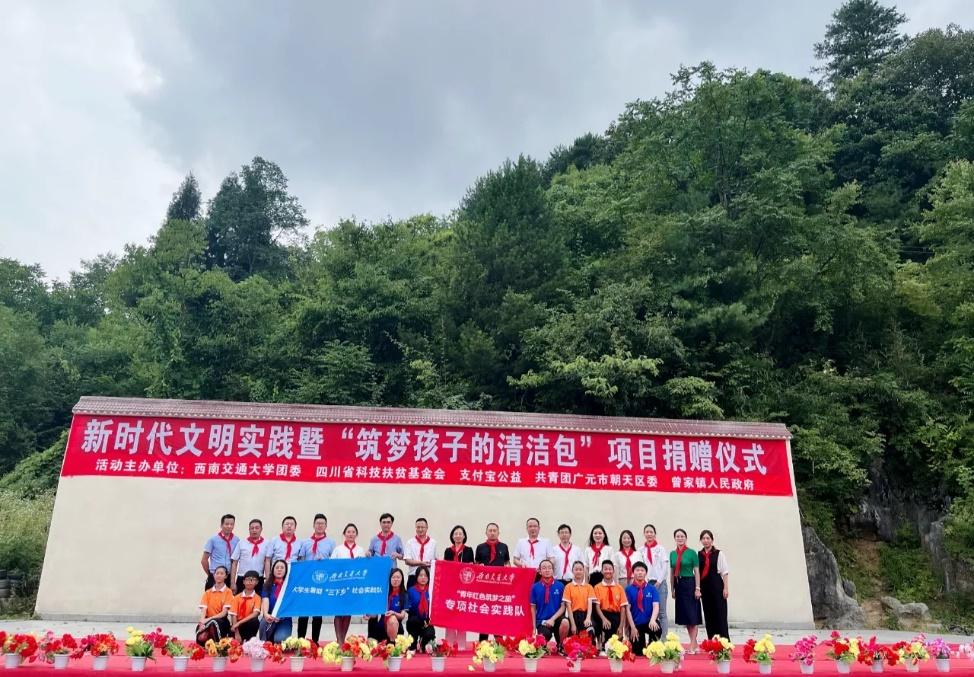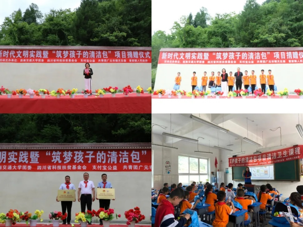 期间,杨爱华副书记一行赴广元市朝天区曾家镇开展了新时代文明实践暨“筑梦孩子的清洁包”项目捐赠仪式。西南交通大学联合四川省科技扶贫基金会,为曾家镇一小、二小两所小学捐赠了价值近16万元的800个爱心清洁包,助力广元乡村振兴和基础教育事业发展。当天,西南交通大学还为曾家镇的两所小学结对授牌,共建社区志愿服务基地。西南交通大学研究生支教团、生命科学与工程学院的志愿者们为曾家镇的小学生开展了清洁包项目课程讲座和志愿服务活动,更好地培养孩子的个人卫生习惯,帮助青少年儿童健康成长。