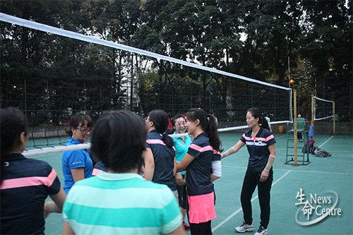 17:30,双方队员在裁判的哨令下,展开激烈的争夺。首局比赛十分精彩,场上好球、妙球迭出。我院女排队率先发球并拿下第一分,附中教职工队也不甘示弱,接连得分,取得了一定优势。面对己方的劣势,本院队员并没有气馁,她们努力守好自己的位置并积极进攻,慢慢扳回比分。场上比赛十分胶着,双方比分不断、交替上升。最终,生命学院队以25:23的微弱优势取得第一局的胜利。