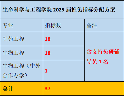 根据西南交通大学《关于公布2025届学院推免名额的通知》,经学院推免工作小组研究决定,现将生命科学与工程学院2025届免试研究生推荐指标分配方案公布如下: