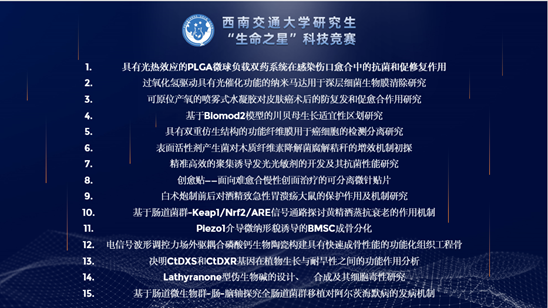 作为西南交通大学唯一的校级研究生生命科学类学科竞赛,西南交通大学第三届研究生“生命之星”科技竞赛的成功举办,对推动生命学科发展进步具有促进意义。在参赛过程中,不仅培养研究生创新意识和实践能力,增强研究生创业理念和创业能力,也为同学们在生命科学、生态与环境保护等相关领域的相互交流与学习提供良好的平台。