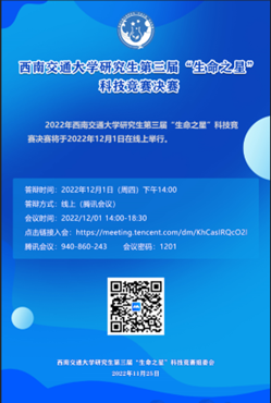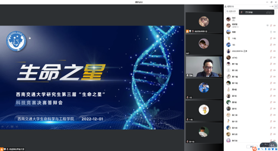 12月1日下午,由西南交通大学研究生院主办,生命科学与工程学院承办,2022年西南交通大学研究生“生命之星”科技竞赛决赛在线上举行。材料科学与工程学院周绍兵教授、屈树新教授,医学院谭欢副教授,生命科学与工程学院副院长高峰教授,生命科学与工程学院王雅雯教授、孟涛教授莅临本次比赛。
