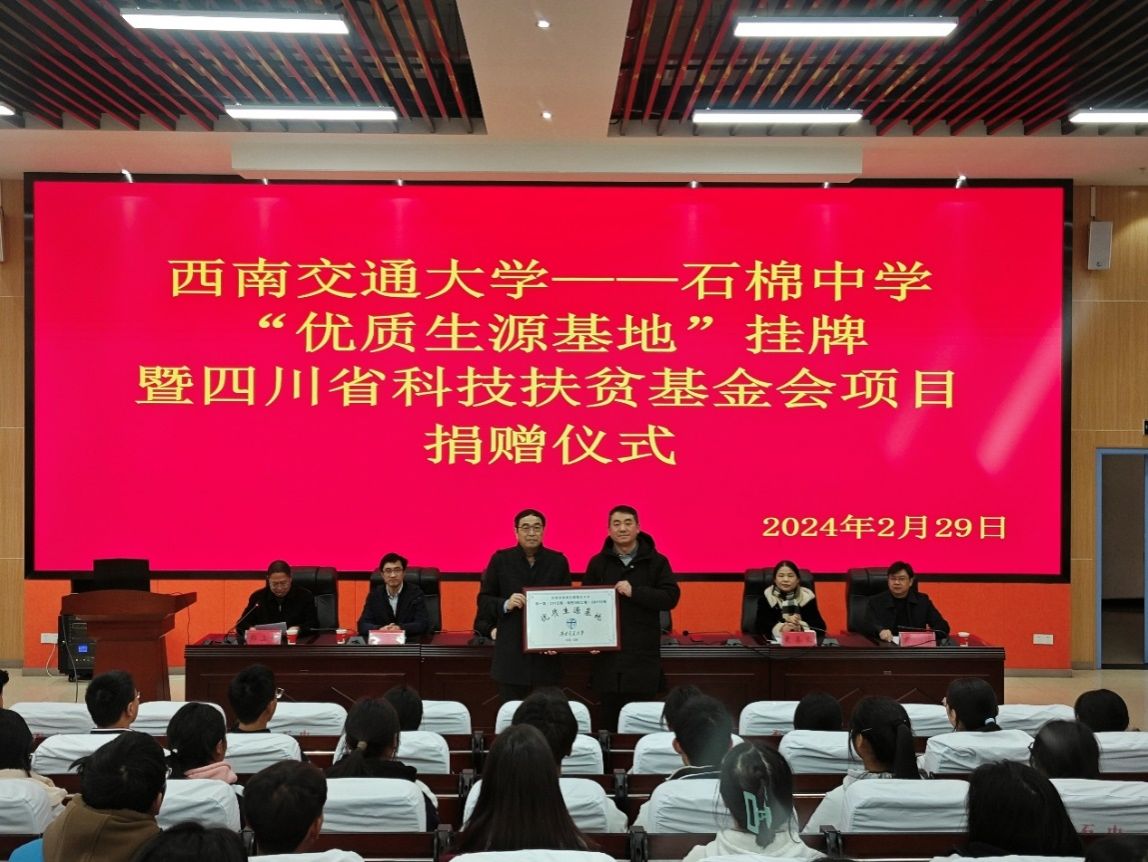 当天下午,在石棉中学举行了西南交通大学-石棉中学“优质生源基地”挂牌暨四川省科技扶贫基金会项目捐赠仪式。西南交通大学招生就业处处长陈岩峰,生命学院党委书记黄春蓉、党委副书记朱炜、院长助理黄新河及6名实践队师生,四川省科技扶贫基金会助理秘书长代作曦,石棉县委常委、宣传部部长尹清以及县教育局、石棉中学等有关单位领导参加了系列主题实践活动。