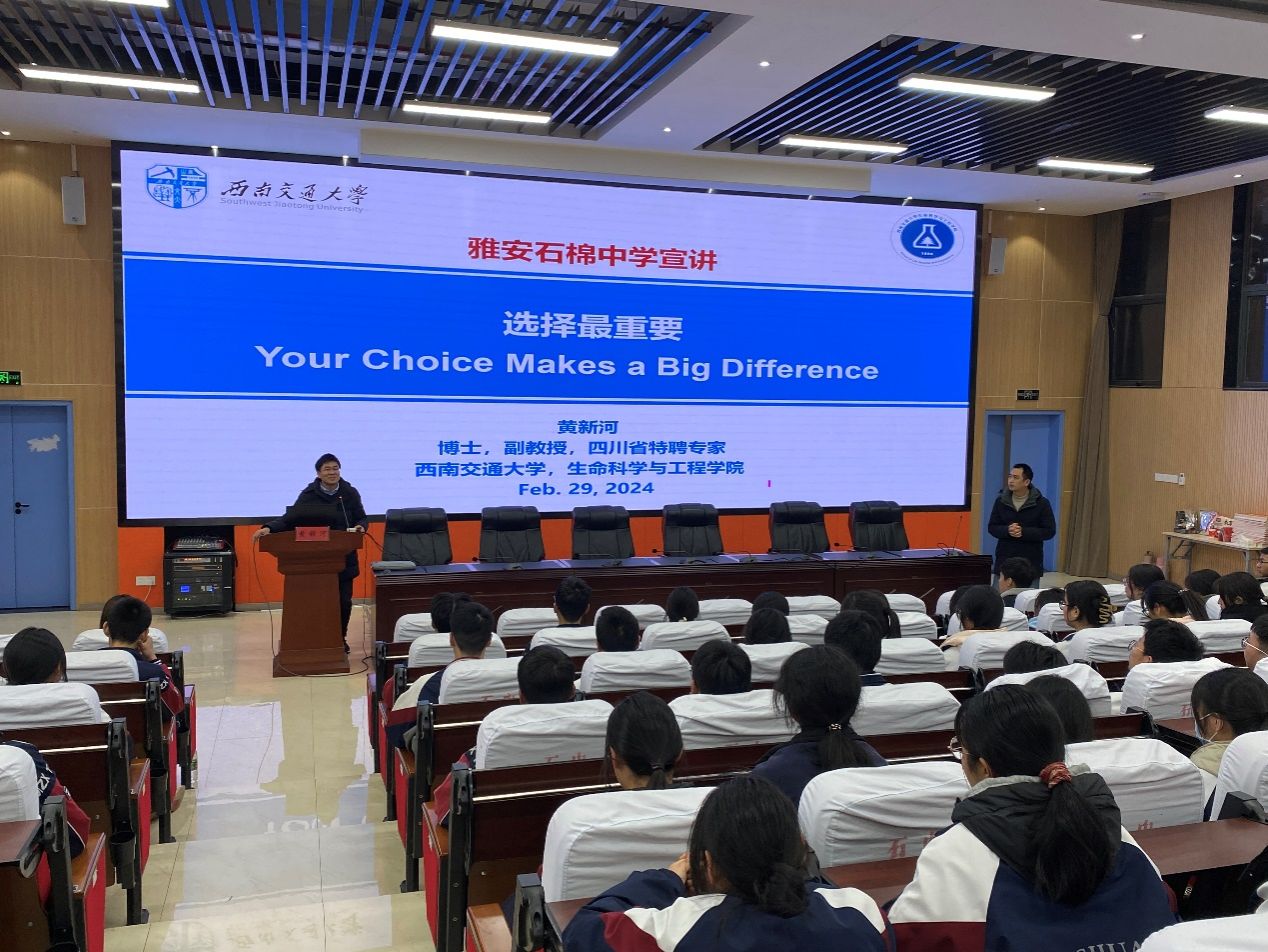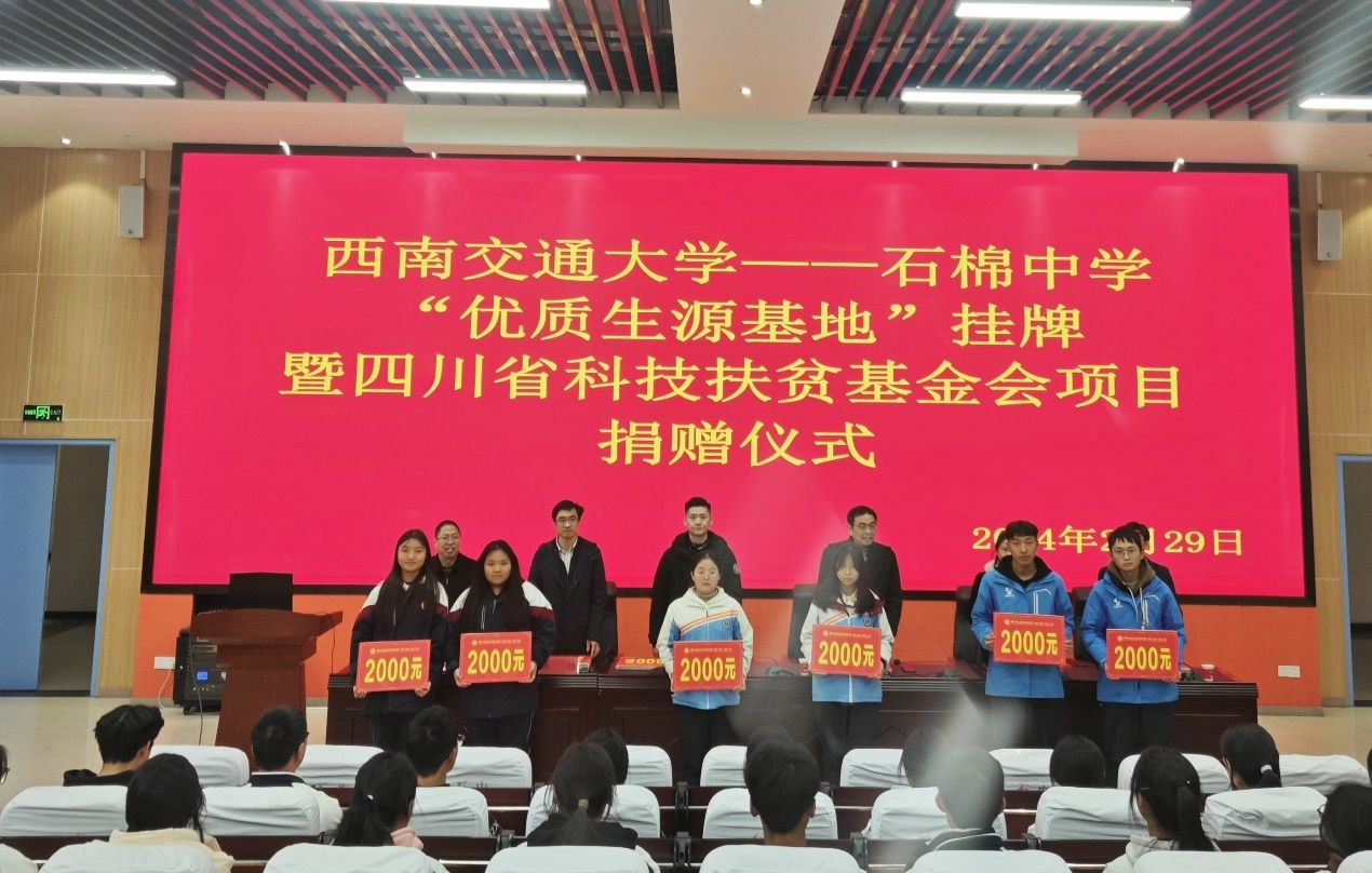 在仪式上,西南交通大学为石棉县中学授牌“优质生源基地”,四川省科技扶贫基金会为石棉中学的50名高中生捐赠10万元“寒门学子大学梦”项目助学金,黄新河副教授以《选择最重要》为题为石棉中学200余名高中学子开展专题报告,生命学院4名实践队员分别深入高三班级开展招生宣讲、高考辅导和咨询答疑活动。