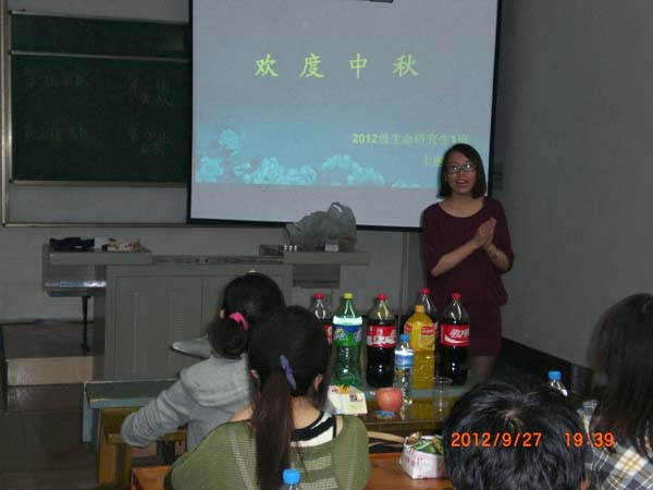 “独在异乡唯异客,每逢佳节倍思亲”“明月几时有,把酒问青天;不知天上宫阙,今夕是何年”。不知不觉,又是一个中秋佳节即将到来之际,校园里到处弥漫着浓浓的节日气氛。9月27日晚上19:00,逸夫楼4505B教室欢声笑语不断,我院2012级生命科学与工程学院一班的同学们在此举行“迎中秋晚会”,迎接他们在研究生阶段的第一个热闹、欢乐的中秋节。