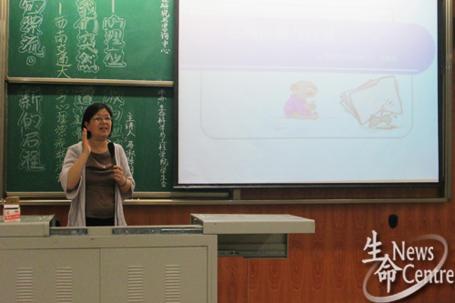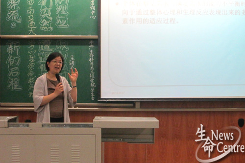 19:30,主持人宣布活动开始之后,马淑琴副教授便用她诙谐、易懂的语言形象地为大家讲解了应激反应的机理、从应激到适应过程的影响因素以及心理防御机制,她强调,应激反应一般会持续6-8周左右,但因人而异,这其中个人经历很重要,以雅安地震为例,经历过汶川大地震的人比这方面经历空白的人要镇定得多。
