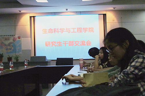 1081930,生命科学与工程学院研究生干部交流会在电气馆3609会议室顺利召开,出席本次交流会的嘉宾有前任生命学院研究生会主席刘凡,副主席陈惠、刘宗瑛以及2012级研究生二班班长宋明珠,全体新任研究生会干部。会议由现任院研会主席邱瑾怡主持,与会新老研究生干部就工作经验进行交流和分享。
