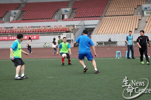 经过简的开幕后,便进入比赛环节。生命学院对阵体育部,这注定是一场艰难的战役。六点半,比赛正式开始,在我院老师的坚守下,双方赛事一直呈胶着状态,各不相让,比分持续为0:0,六点四十五,体育部在多方努力下终于踢进本场比赛的第一个球。下半场开始,我院依然坚持稳打稳扎的原则,不急不躁,七点,我院踢进第一个球,周围观众一阵欢呼。