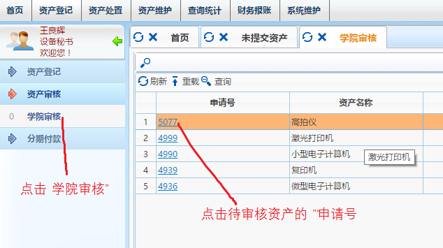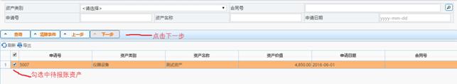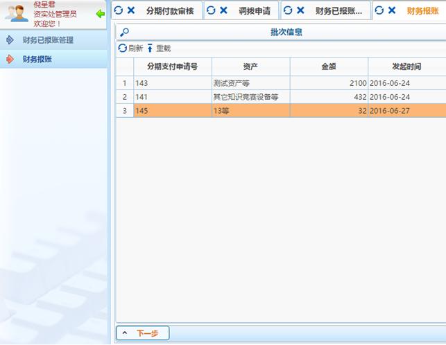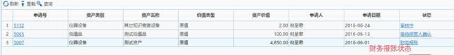 资产经过单位设备秘书、资实处审核后,进入“财务报账”状态