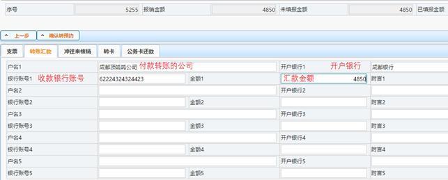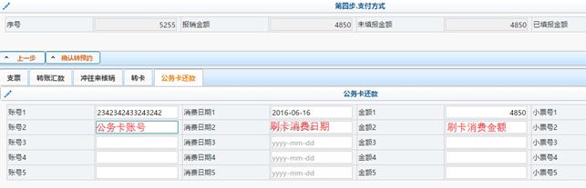 在支付窗口界面,主要有支票、转账汇款、冲往来核销、转卡、公务卡还款五种方式,常用的方式为转账汇款和公务卡还款方式。