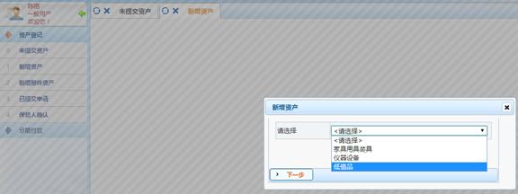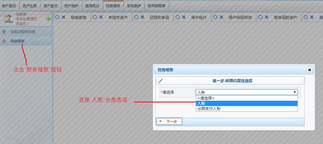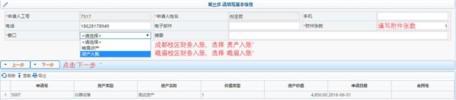 如在成都校区计财务处入账,则选择“资产入账”窗口,如在峨眉校区财务处入账,则选择“峨眉资产窗口。然后点击下一步。