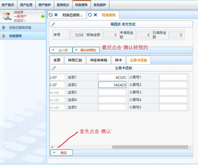 填好相关付款信息后,点击“确认“按钮,最后点击“确认转预约”按钮,资产信息和报账信息传输到财务预约报账系统中。