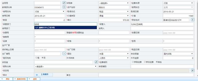 (3)填写保管部门和保管人。例如:输入“材料,系统自动提示“1/1材料科学与工程学院”条目后,选中该条目。